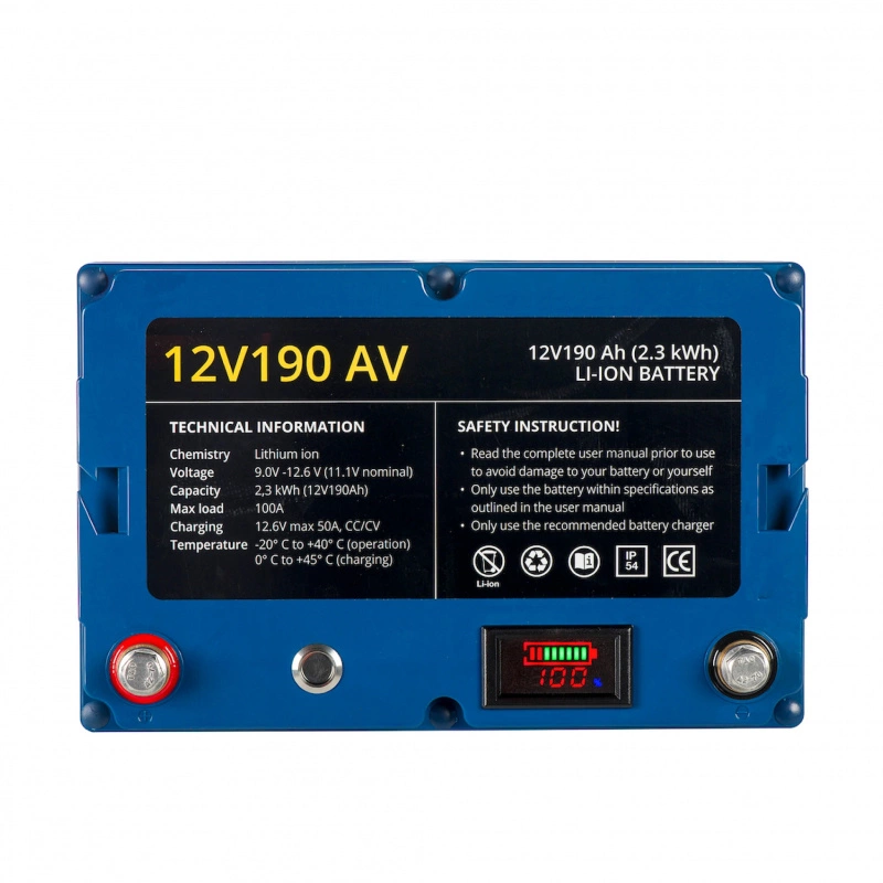 Avec plus d’écrans et de capteurs dans les bateaux, la consommation électrique a augmenté ces dernières saisons. Pour répondre au besoin de pouvoir disposer d’un réseau de plusieurs appareils et solutions de capteurs, un parc de batteries 12V stable est nécessaire. Par conséquent, Rebelcell a conçu et développé 12V190 AV comme solution au problème. Il ne pèse que 12,5 kg et se recharge en 6-7h (avec chargeur 35Ah).La batterie est équipée d’un affichage LED qui fournit des informations sur le pourcentage de capacité qu’il vous reste et la tension dont vous disposez. la batterie. La batterie correspond à un ensemble de batteries au plomb de 340 AH et peut bien fonctionner comme batterie consommable pour voiliers, bateaux à moteur ou camping-cars / caravanes. La haute performance de la batterie permet une décharge à 100 % sans affecter négativement la batterie ou les cycles de vie. 12V190 AV est équipé d’un BMS qui gère les décharges, les pics de tension et les mauvaises manipulations. La batterie est garantie 2 ans.Compact et léger : La batterie ne pèse que 12,5 kilos.Performances maximales : puissance constante même lorsque la batterie est faible, vous pouvez la décharger jusqu’à 100 % sans aucune conséquence négative sur les performances ou la durée de vie.Convivial : La batterie est légère et compacte. Il dispose d’un affichage LED et la batterie peut être utilisée avec des convertisseurs AC-DC standard.Facile à charger : Recharge complète en 6-7 heures. Peut également être chargé avec des cellules solaires (un contrôle spécial est nécessaire dans ce cas)Haute fiabilité et longue durée de vie : BMS intégré qui contrecarre les décharges profondes, les pics de tension et les températures élevées, etc. Avec BMS et une utilisation appropriée, la batterie peut conserver les mêmes performances pendant 10 ans.Garantie de 2 ansInformations importantesCharger uniquement avec le chargeur de batterie Li-ion recommandé avec profil de charge CC/CV et tension de 12,6 V max 95 A. Toujours utiliser un fusible approprié entre la batterie et le moteur de pêche à la traîne pour protéger les deux. Utilisez des câbles de batterie suffisamment épais avec des connecteurs à languette M8 (ou des connecteurs ANEN) pour connecter votre moteur de pêche à la traîne pour une connexion sécurisée et fiable. N’utilisez jamais de pinces crocodiles pour vous connecter à la batterie. Ces connexions ne sont pas sûres et peuvent générer de la chaleur et endommager votre moteur de pêche à la traîne et votre batterie. Les dommages causés par des connecteurs ou des câbles inappropriés sont expressément exclus de nos conditions de garantie.Cette batterie ne convient pas à une utilisation dans les caravanes. Les courants élevés peuvent causer des dommages irréversibles à votre batterie. Les Batteries peuvent être connectées en parallèle pour une capacité accrue. Assurez-vous toujours que les batteries sont du même type, âge et état de charge avant de connecter et d’utiliser des câbles d’une épaisseur suffisante.Les batteries de Rebelcell sont étanches selon la norme IP54. Ils ne peuvent pas être complètement immergés dans l’eau ou supporter de fortes pluies. Les dégâts d’eau ne sont pas soumis à nos conditions de garantie.Chimie Lithium-ionTension 11.1VCapacité (C1-C20) 190AhEqPb ( équivalent plomb-acide) jusqu’à 12V340AhÉnergie nominale 2,3 kWhDécharge continue maximale 120A Décharge maximale (10 sec) 140A Durée de vie (#charges) (@80%DoD ) ~1500Durée de vie (#charges) (@100%DoD) ~1000Dimensions 262x175x220 mmPoids ~ 12,5 kGDensité énergétique ~ 180 Wh/kGTension de bande passante 9,0 V ~ 12,6 VTempérature de charge 0 °C ~ 45 °CTempérature de décharge -20 °C ~ 60 °C Température de Stockage 0 °C-45°CIndicateur d’état de chargeoui, numériqueCourant de charge maximum 95AÉquilibrage des cellules intégré ouiProtection haute température oui Protection contre les courants de décharge maximum ouiProtection contre les surtensions ouiProtection contre les sous-tensions ouiNormes (IEC 529) IP54Certificat CE ouiGarantie 2 ans