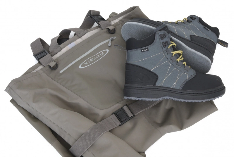 Une combinaison qui vous gardera au sec dans n’importe quelle rivière ou lac, le combo de wading Vision Atom ne vous laissera jamais tomber ! Waders Wader d’entrée de gamme avec qualité et détails. Atom est un wader léger entièrement fabriqué à partir d’un tissu solide à 3 couches. Les chaussettes en néoprène ont des parties inférieures plus denses pour une résistance à l’usure et une longévité maximales et la coupe globale du wader minimise les coutures dans les zones critiques. La grande poche poitrine contient de nombreux objets et la poche intérieure à rabat est l’endroit idéal pour les objets que vous souhaitez conserver en lieu sûr. La poche à rabat dispose également d’un velcro pour attacher une pochette de téléphone étanche séparée. Les bretelles et la ceinture réglables sont fabriquées à partir d’un matériau élastique vous permettant d’ajuster l’ajustement dans un confort maximum.• Construction légère à 3 couches• Tissu F3 imperméable et respirant• Coupe incurvée NoSeam pour un ajustement parfait• Ceinture et bretelles de couleur assortie• anneaux en D et amp ; boucles d’accessoires• Poche à rabat traditionnelle avec fermeture éclair• Pare-graviers intégrés• Pieds en néoprène avec design côté gauche et côté droitChaussures de wadingAtom est une chaussure en tissu traditionnel et la plus légère de la gamme Visions. Par conséquent, il est idéal pour ceux qui aiment voyager et pour ceux qui n’ont pas besoin du soutien maximal de leurs chaussures de wading. Le matériau en PVC de la partie avant est là pour résister aux coups les plus durs et, avec la semelle intercalaire en EVA solide et abritant, ils rendent cette chaussure durable en utilisation normale.• Conception globale très rigide• Disponible avec des semelles en feutre et en caoutchouc Gummi• Peut être clouté avec des clous Vision Tungsten